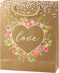 Táto darčeková taška sa pýši jemným spojením krásnych, farebných kvetov a nápisu "Love". Drobné brokátové bodky na vrchole tašky pridávajú jemnosť a ľahkosť.