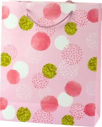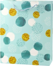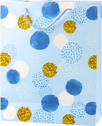 Bodky rôznych veľkostí, niektoré s trblietavým efektom alebo dekoratívnou potlačou, dodávajú celku originálny a efektný charakter. Taška je vyrobená z odolného laminovaného papiera, ktorý je odolný voči ohybom, čo umožňuje bezpečné zabalenie aj ťažších darčekov.