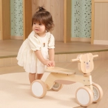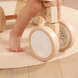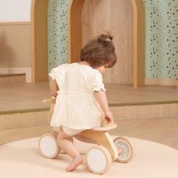 Prvé krôčiky do sveta jazdy zvládnu deti s istotou vďaka stabilnej štvorkolesovej konštrukcii a pohodlnému sedlu s opierkou proti skĺznutiu. Odrážadlo je vyrobené z kvalitného dreva a má tiché EVA kolieska, ktoré sú šetrné k podlahe a zvládnu aj hladké vonkajšie povrchy.