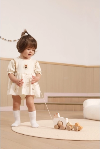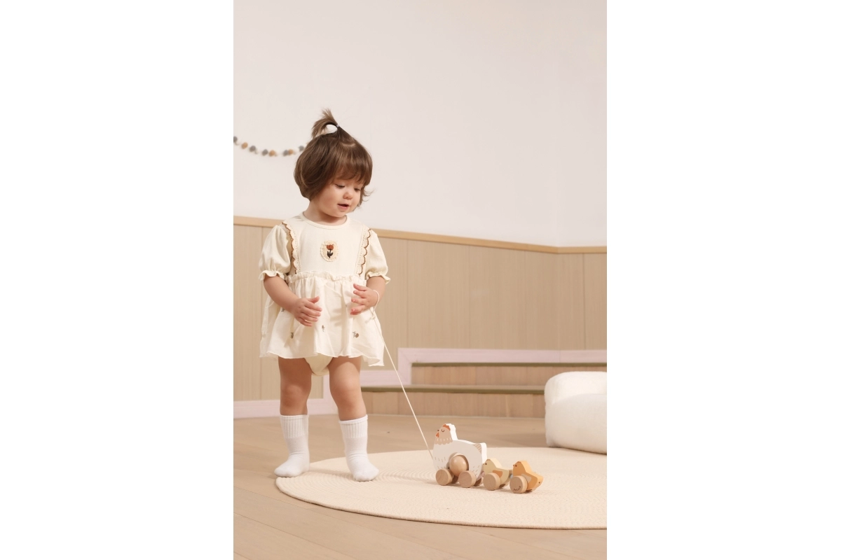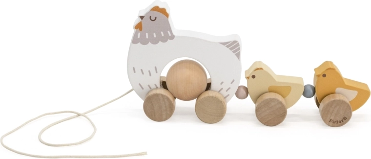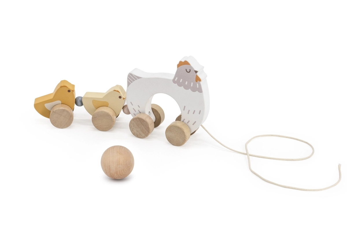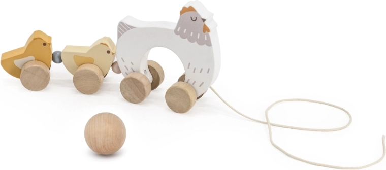 Hračka je vyrobená z kvalitného dreva so zaoblenými hranami na bezpečné používanie. Neutrálne prírodné a pastelové farby výborne zapadnú do moderného detského izbičky. Vďaka plynulým kolieskam a šnúrke sa sliepočka s kuriatkami ľahko ťahá po podlahe a stáva sa tak motiváciou k chôdzi.