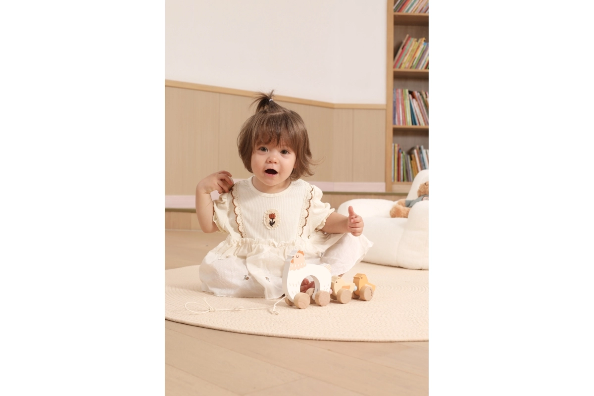 Kvalitné drevo, hladké hrany a odolné kolieska zaisťujú dlhú životnosť hračky a bezpečie pri hre.