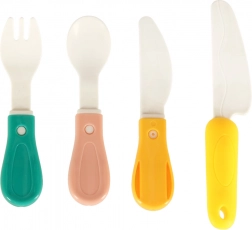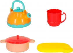 - Kuchynské doplnky (15 ks): kanvička, hrniec s pokrievkou, príbory (veľký a malý nôž, lyžička, vidlička), hrnček, krájacia doska, detská platnička/kuchynka, košík.