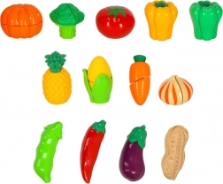 - Ovocie a zelenina na suchý zips (13 ks): hrášok v struku, zelená paprika, žltá paprika, chilli paprička, cibuľa, brokolica, kukurica, paradajka, ananás, tekvica, baklažán, fazuľa, mrkva.