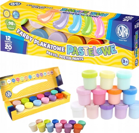 Pastelové temperové farby ASTRA 12×20 ml s vysokou krycou schopnosťou. Riediteľné vodou, matný povrch, odolné voči svetlu. Ideálne do školy aj domov.
