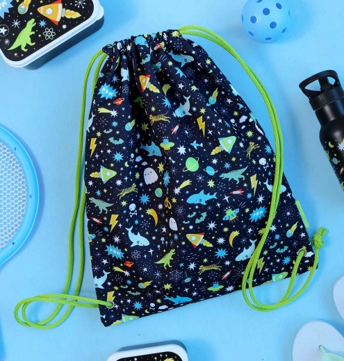 Štýlový a ľahký vak na chrbát s vesmírnym motívom si deti obľúbia pre pohodlné nosenie aj jednoduchú údržbu. Sťahovacia šnúrka slúži zároveň ako ramenné popruhy a umožňuje rýchle otvorenie aj zatvorenie. Vo vnútri nájdete praktické vrecko na zips, ktoré bezpečne schová kľúče, vreckové alebo iné drobnosti.