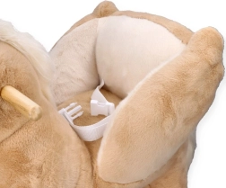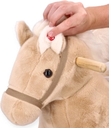 Napájanie zabezpečujú dve batérie AA, ktoré sú bezpečne uložené vo vrecku pod bruškom koníka. Hračka spĺňa normy CE a ponúka stabilnú konštrukciu, pohodlné sedadlo a zábavu na dlhé hodiny.