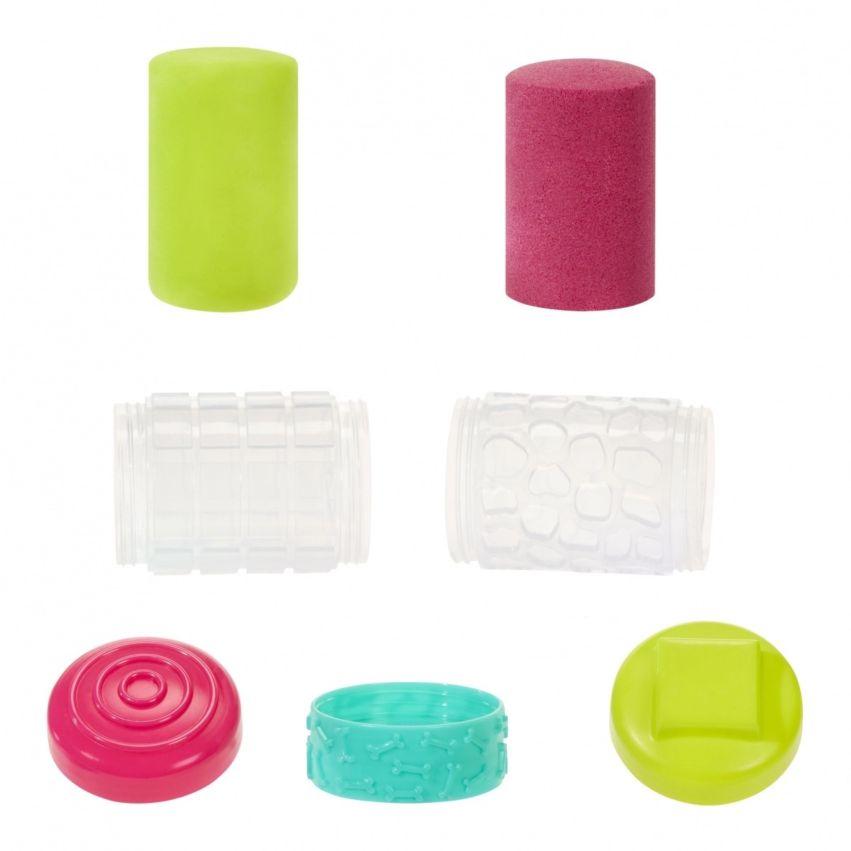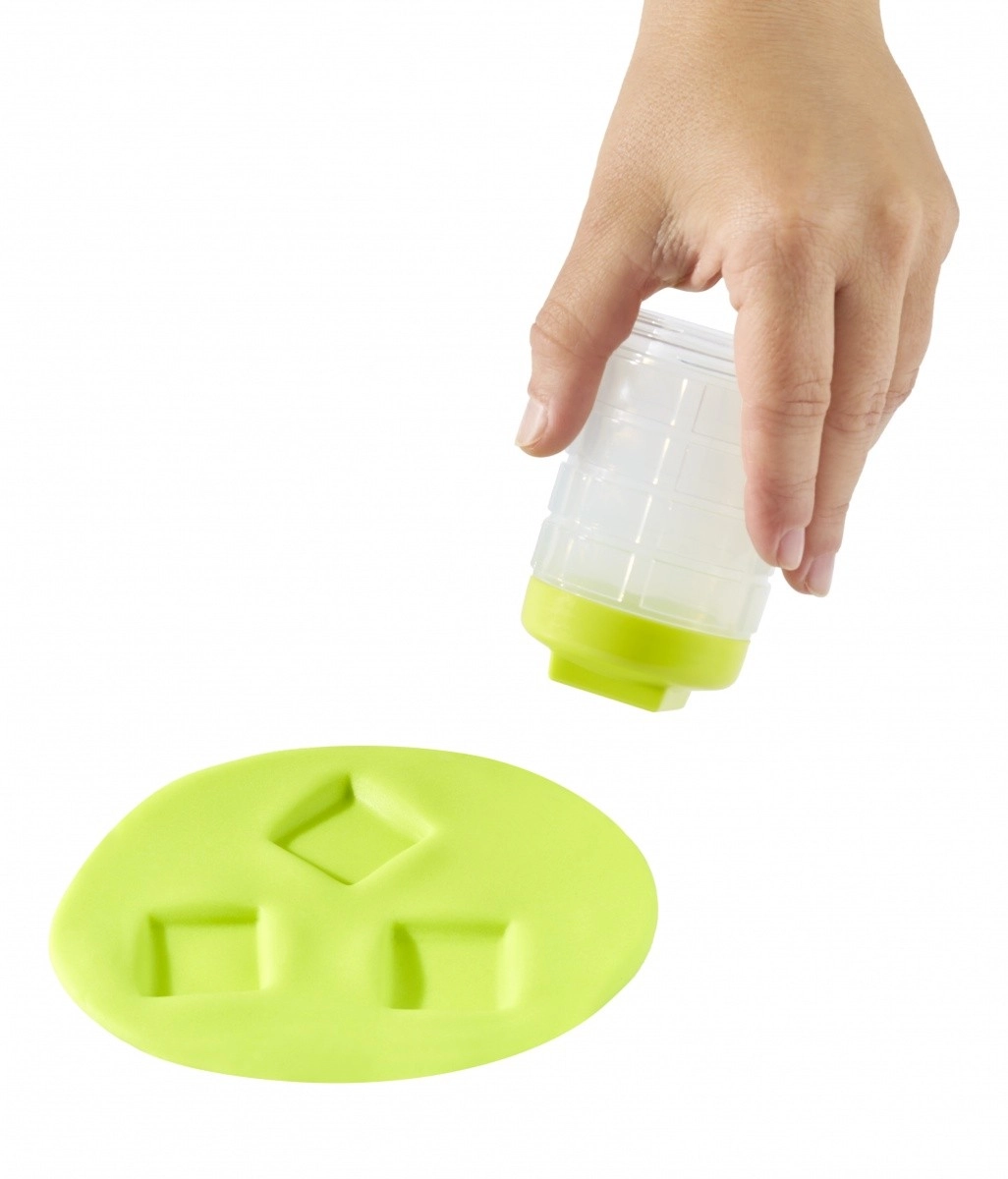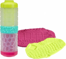 Súčasťou je multifunkčný nástroj 4 v 1 s vymeniteľnými koncovkami na valcovanie a razbu vzorov. Udržateľné a chytré balenie funguje zároveň ako súčasť hry: viečka slúžia ako pečiatky a spojka ako textúrovací valček. Možno kombinovať hmotu s pieskom a vytvoriť tak novú zmes s jedinečnou haptikou, ktorá podporuje zmyslové vnímanie a kreativitu.