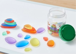 Sada obsahuje 36 prvkov v 6 živých farbách (žltá, červená, modrá, zelená, oranžová, fialová), v rôznych veľkostiach až do priemeru 8,5 cm pri najväčšom kameni. Nerovnomerné/asymetrické tvary sú skvelé na umelecké kompozície, učenie pojmov ako väčší–menší, nad–pod a precvičovanie koordinácie oko–ruka.