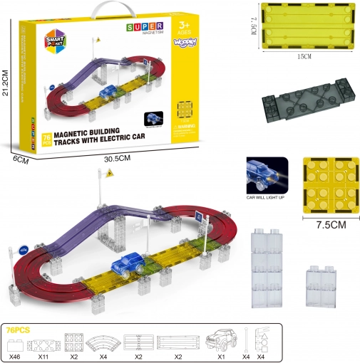 Magnetická pretekárska dráha WOOPIE s LED autíčkom, 76 dielov. Jednoduché magnetické spájanie, viacúrovňové trate, kvalitné materiály. Skvelá zábava od 3 rokov.