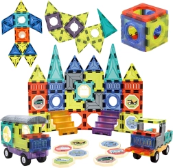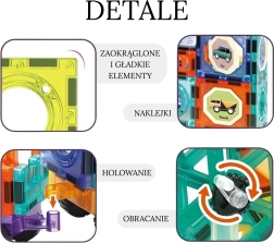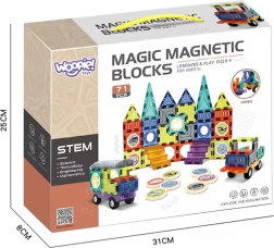 Objavte svet kreativity so stavebnicou magnetických kociek 3D od značky WOOPIE. S 71 dielmi deti postavia fantazijné zámky, vozidlá aj priestorové tvary. Silné magnety, priehľadné farebné diely a samolepky s motívmi dopravných prostriedkov zabezpečujú dlhé hodiny zábavy a učenia hrou. Skvele rozvíja jemnú motoriku, logické myslenie a priestorovú predstavivosť.
