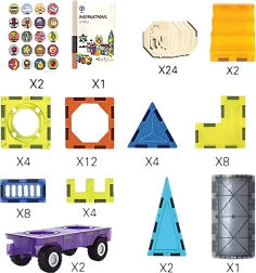- 4× štvorec s otvormi, 12× osemuholník, 4× trojuholník, 8× diel v tvare L, 24× karty so samolepkami/obrázkami, 2× podlhovastý obdĺžnik („tehla“), 8× štvorec s mriežkou, 4× trojuholník s polkruhom (schodíky), 2× podvozok s kolesami, 2× vysoký trojuholník (veža), 1× valec (strieška), 2× arch samolepiek, 1× návod/STEAM sprievodca