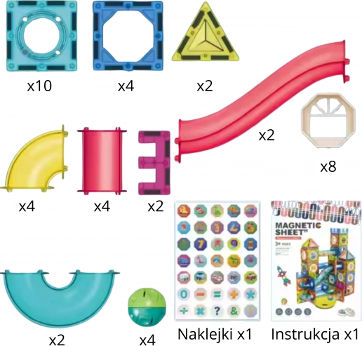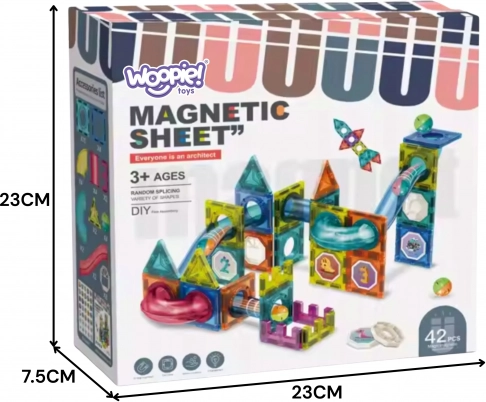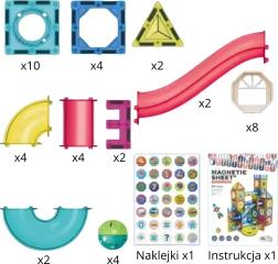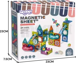 Súprava obsahuje 42 komponentov vrátane magnetických dlaždíc a tvarovaných sekcií dráhy, vďaka ktorým možno vytvárať rozmanité, stabilné a zábavné konštrukcie. Diely sa k sebe ľahko a pevne prichytia pomocou výkonných magnetov, takže zvládnu aj odvážnejšie projekty.