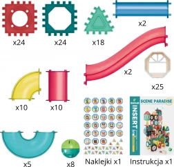 Veľká sada 128 kusov ponúka širokú škálu tvarov a farieb na tvorbu jednoduchých aj pokročilých projektov. Priehľadné prvky umožňujú sledovať pohyb guľôčok a prirodzene vysvetľujú zákony rýchlosti, gravitácie a zotrvačnosti. Hra rozvíja kreativitu, trpezlivosť aj technické zručnosti.