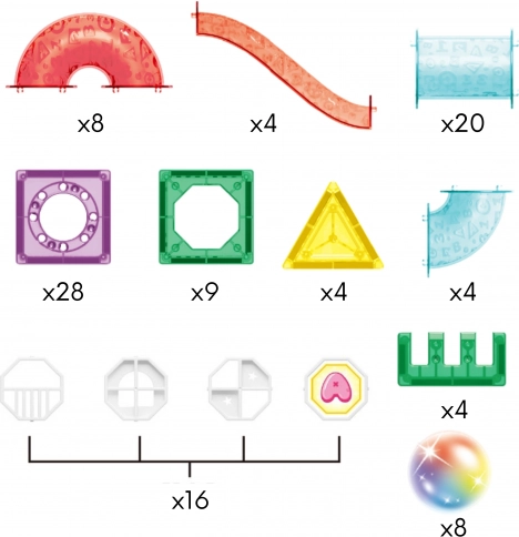 - 28 štvorcov s okrúhlym otvorom, 9 štvorcov, 4 trojuholníky, 8 zakrivených dielov (štvrtkruh), 4 rovné diely, 20 dielov tunela, 4 diely v tvare „U“, 8 guľôčok (svietiacich), 16 konektorov