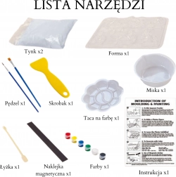 - Kompletné balenie – formy, sadra, farby, štetce a nástroje vrátane mištičky na miešanie.