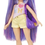 Súčasťou je zladený outfit s potlačou, žlté šortky, fialové topánky a kabelka. Detailné doplnky dodajú každej scénke ten pravý módny šmrnc.