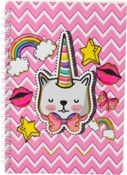 Tento štýlový a praktický zošit spája funkčnosť s hravým dizajnom. Ružový obal so vzorom cikcak a motívmi ako duhy, hviezdičky, pery či mašličky priťahuje pozornosť a dodá každému písaniu štipku mágie. Hlavnou ilustráciou je mačka s rohom jednorožca, ktorá zošitu prepožičiava rozprávkový nádych.
