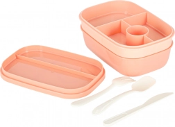 Box je vyrobený z kvalitného plastu bez BPA. Možno ho umývať v umývačke a ohrievať v mikrovlnnej rúre (bez veka) až do 100 °C. V balení navyše nájdete praktickú sadu príborov (lyžica, vidlička, nôž).