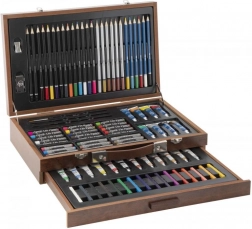 Obsah sady je zostavený tak, aby pokryl celé spektrum výtvarných potrieb – od kresby po akryl aj akvarel. Ľahko si vyskúšate suché aj mokré techniky, kombinovanie vrstiev aj miešanie odtieňov. Vďaka praktickému baleniu je sada vhodná domov, do školy aj na cesty.