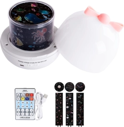 Tento detský projektor s nočnou lampičkou vykúzli upokojujúcu atmosféru na zaspávanie aj hravú dekoráciu počas dňa. Vďaka 6 rôznym projekčným scénam (narodeniny, drevený koník, Santa, morský dinosauří park, raketa a UFO, zvierací park) si dieťa každý deň užije iný príbeh. Lampička sa ľahko zmení z projektora hviezd na pokojné nočné svetlo sňatím vnútorných membrán a zaklopením horného veka.