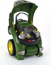 Súčasťou je komplet detského náradia (skrutkovač, kľúč, kľúč na sviečky), úložné schránky na skrutky a integrovaný zdvihák pre jednoduchú výmenu kolies. Deti si precvičia jemnú motoriku, logické myslenie a kreativitu pri „servise“ svojho traktora – od kontroly oleja cez výmenu sviečok až po demontáž mriežky chladiča.