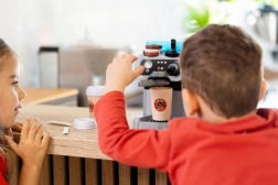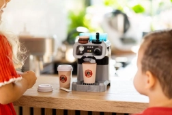 Štýlový detský espresso kávovar s bohatým príslušenstvom pre realistickú baristickú hru. Súčasťou sú 2 kelímky s viečkami, portafilter, 3 kávové kapsule, 2 sáčky cukru a tamper. Kávovar má nádržku na vodu a funkciu prietoku, takže deti môžu „uvariť“ kávu ako ozajstní baristi.