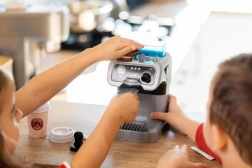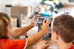 Tento moderný a deťom priateľský kávovar premení detskú kuchynku na malú kaviareň. Stačí naplniť nádržku vodou, vložiť kapsulu, jemne ju stlačiť tamperom a stlačiť tlačidlo – voda potečie do kelímka ako skutočné espresso. Ideálne na kreatívne hranie s kamarátmi, súrodencami aj plyšákmi.