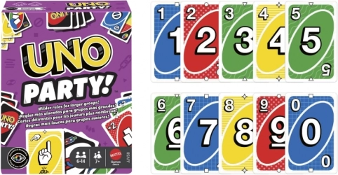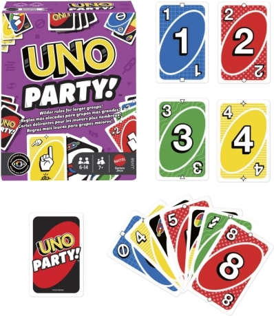 UNO Party prináša osvedčenú hrateľnosť obľúbenej hry UNO vo väčšom a hlučnejšom balení – ideálne na párty, rodinné oslavy aj večery s priateľmi. Vďaka 168 kartám (1,5× klasického balíčka) si hru užije viac hráčov a napätie vydrží dlhšie.