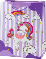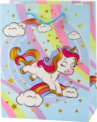 Farebná darčeková taška s motívom jednorožca je ideálna na elegantné odovzdanie drobných darčekov. Ponúka pevný kvalitný papier, štýlové šnúrkové uško a univerzálne rozmery 23 × 16 × 10 cm. Vďaka rozprávkovým vzorom s dúhou, hviezdičkami a obláčikmi pôsobí kúzelne a zabezpečí pôsobivé balenie darčeka.
