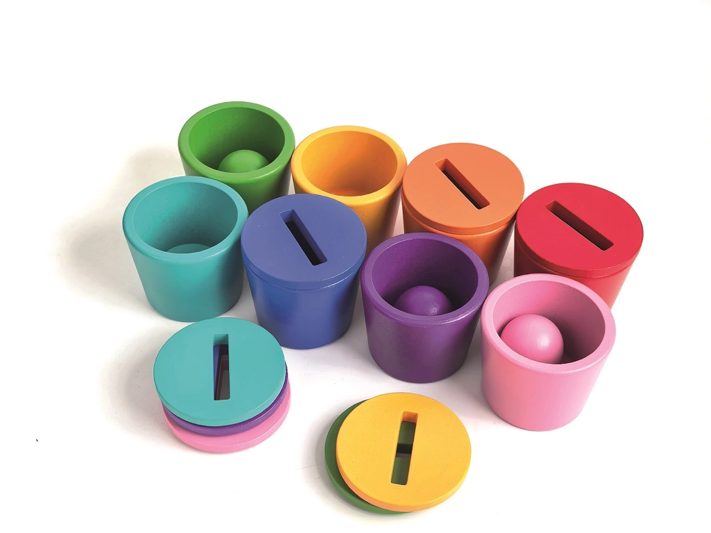 Farebné kalíšky s viečkami a štrbinami umožňujú vkladanie diskov, čo podporuje sústredenie, trpezlivosť a rozvoj motorického plánovania.