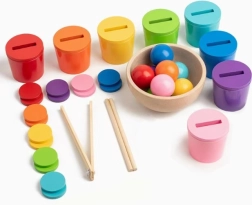 Zábavná montessori sada z certifikovaného dreva FSC na triedenie podľa farieb a rozvoj jemnej motoriky. Deti pomocou lyžičky, pinzety alebo paličiek prenášajú guľôčky a mince do kalíškov, trénujú koordináciu ruka–oko a sústredenie. Obsahuje 8 výrazných farieb, misku a viečka s otvormi na mince. Podporuje zmyslové vnímanie, jemnú motoriku a učenie hrou.