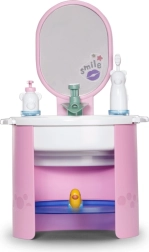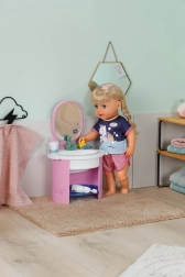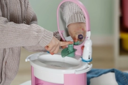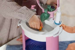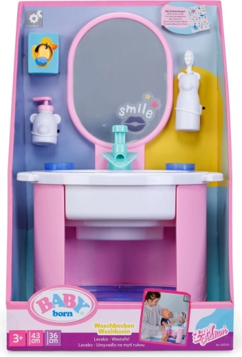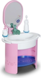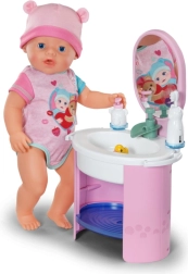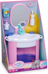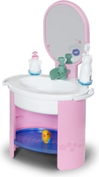 Doprajte deťom realistickú starostlivosť o ich bábiku s umývadlom BABY Born bez batérií. Skutočná voda sa do umývadla dostáva pumpovaním kohútika, o zábavu sa postará legrační špunt Berta a nechýba zubatá kefka s mechanickými vibráciami ani dávkovač mydla. Umývadlo možno navyše ozdobiť farebnými samolepkami. Vhodné pre deti od 3 rokov.
