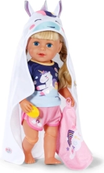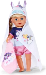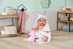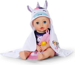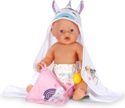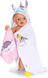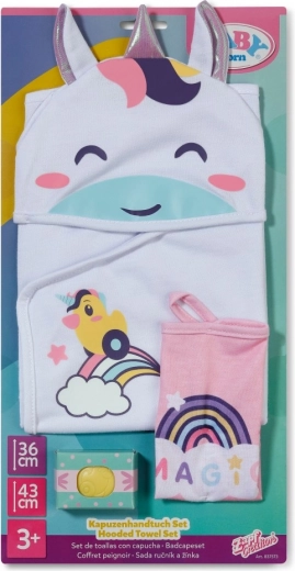 Doprajte svojej bábike po kúpaní maximálne pohodlie s touto roztomilou sadou uterákov BABY born. Obsahuje dva mäkučké kúsky s motívom jednorožca a dúhy, kapucňu s potlačou a uškami. Ideálne pre bábiky veľkosti 36 cm a 43 cm. Mäkký materiál, čarovný motív jednorožca a praktická kapucňa pre štýlové sušenie a hranie.