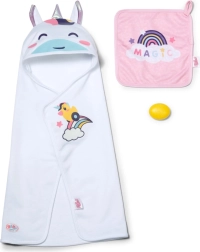 Táto čarovná sada uterákov BABY born prináša všetko, čo potrebujete pre zábavné kúpeľové rituály. Dva uteráky s motívom dúhy a jednorožca potešia každého malého opatrovateľa, zatiaľ čo kapucňa s dúhovým rohom a roztomilými uškami dodá každému sušeniu veselý nádych.