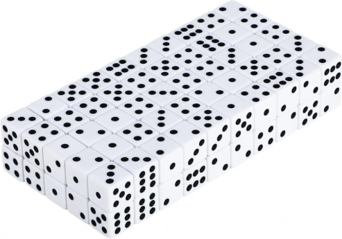 Praktická sada 100 bielych hracích kociek s klasickým označením 1–6 je ideálna pre školy, kluby aj domáce hranie. Kocky z odolného plastu s čiernymi, dobre čitateľnými bodkami a príjemne hladkým povrchom zabezpečia dlhú životnosť a komfort pri hre.