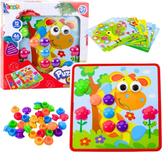 Táto kreatívna mozaika spája učenie so zábavou: deti podľa predlôh alebo vlastnej fantázie nasadzujú farebné gombíky do otvorov a trénujú tak logické myslenie aj trpezlivosť. Vďaka pestrej palete farieb a roztomilým motívom sa k hre rady vracajú – a upratovanie je ľahké vďaka praktickému organizéru.