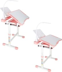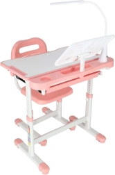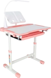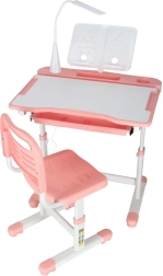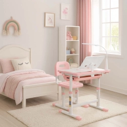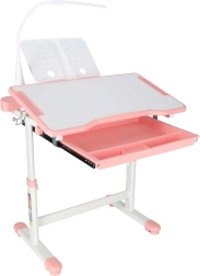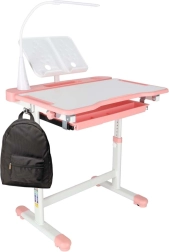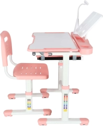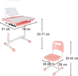 Praktická detská písacia súprava so svetloružovým dizajnom ponúka rastúcu konštrukciu stola aj stoličky, naklápaciu pracovnú dosku až do 55°, priestranný výsuvný šuplík s priehradkami a LED lampičku s napájaním USB s 3 režimami svetla a 3 úrovňami jasu. Nechýba držiak na knihu, háčik na batoh ani držiak na nápoj pre poriadok a pohodlie pri učení aj tvorení.