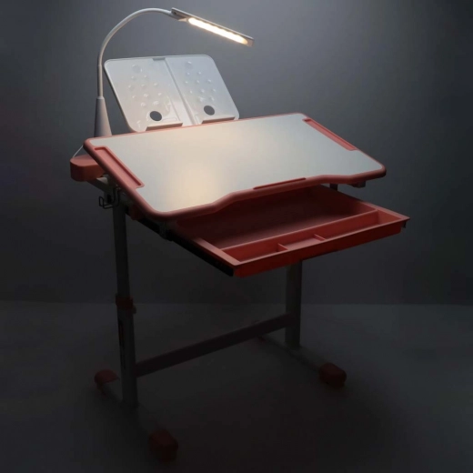 Integrovaná LED lampička s napájaním cez USB ponúkne 3 teploty svetla (teplá, studená, zmiešaná) a 3 úrovne jasu pre šetrné osvetlenie očí po celý deň. Priestranná výsuvná zásuvka s organizérom pomôže udržať na ploche poriadok, držiak na knihu uvoľní ruky a háčik na boku pojme batoh či tašku.