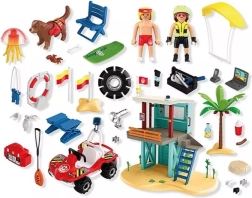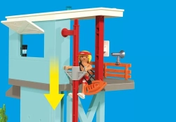 Tento detailne spracovaný set prináša dvojpodlažnú záchrannú vežu s rýchlym zjazdom po tyči, plne vybaveným stanovišťom záchranára a spodným servisným kútikom s náradím. Nechýba plážové buggy na akcie ďalej od veže, záchranné prkno a verný záchranársky pes v veste.