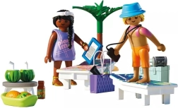 Užite si letnú pohodu s PLAYMOBIL setom pre dvoch! Ležadlá, slnečník, palma, chladené nápoje a ovocie vytvárajú dokonalú atmosféru na pláži. Mužská figúrka má UV citlivú potlač zobrazujúcu spálenie od slnka – pripomienka, že opaľovací krém je nutnosť. Praktická plážová taška a chladiaci box udržia všetko po ruke a v chlade.