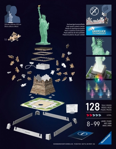 Objavte zábavu z priestorového skladania s 3D puzzlom Socha slobody od značky Ravensburger. Dieliky z pevného plastu vďaka technológii Easy Click presne do seba zapadajú a vytvárajú stabilný model bez použitia lepidla – ideálne pre fanúšikov architektúry aj milovníkov puzzle.