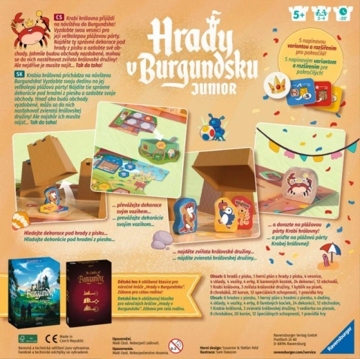 Krabia kráľovná usporadúva kráľovskú plážovú párty a potrebuje vašu pomoc s výzdobou! V detskej verzii obľúbenej hry Hrady v Burgundsku sa malí hráči vydajú na dobrodružstvo plné pieskových hradov, kde si precvičia bystrú hlavu a taktiku. Pomocou kociek odkrývajú správne dekorácie, prevezú ich do svojej dediny a získavajú body za múdro zvolené rozhodnutia.