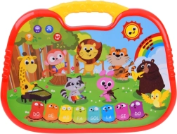 • Prehrávanie melódií – každý stisk zahrá ďalší tón známej pesničky (napr. Old MacDonald, Twinkle Little Star). Výber skladby mení červené tlačidlo so šípkami.