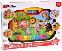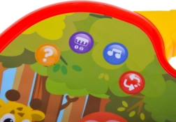 - Učenie názvov: po stlačení obrázka hračka povie názov zvieratka/nástroja; po stlačení červeného tlačidla a znovu obrázka prehrá ich zvuky.
