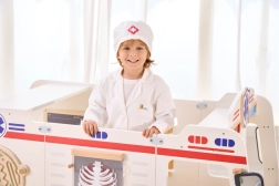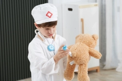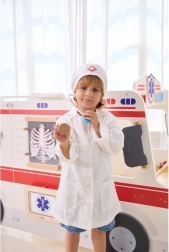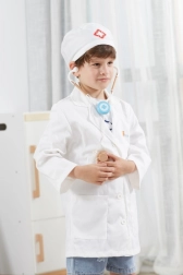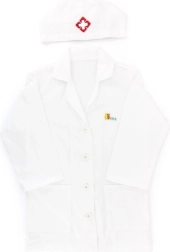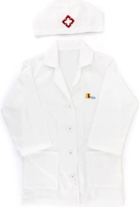 Biely plášť a čiapka s medicínskym symbolom podporia detskú predstavivosť a dodajú hraniu reálny nádych.