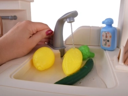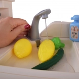 Otváracie dvierka rúry a úložných skriniek aj chladnička s potravinami pozývajú deti k servírovaniu, pečeniu a ukladaniu zásob.