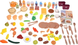 - hrniec s pokrievkou, panvica, kanvička, taniere, hrnčeky, príbory, kliešte, naberačka, doska, koreničky a fľaštičky, karty jedálneho menu, potraviny (ovocie, zelenina, vajce, huba, mäso, ryba, hamburger, steak), dieliky na sendvič/bagetu/burger