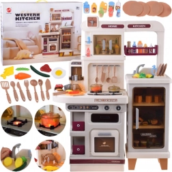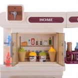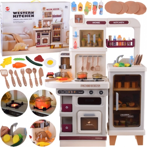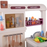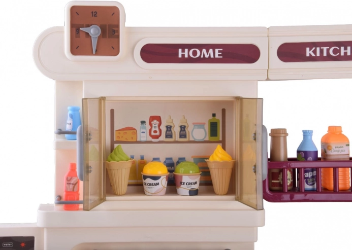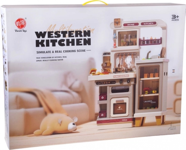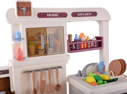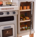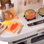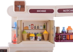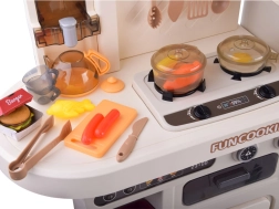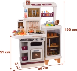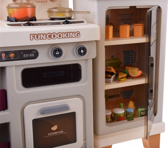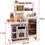 Veľká plastová detská kuchynka v jemných béžových odtieňoch premení každú detskú izbu na kulinárske štúdio. Ponúka svetelné a zvukové efekty, realistický paru produkujúci varič, otváracie dvierka rúry a skriniek, funkčný pumpovací kohútik a bohaté príslušenstvo pre fantastickú hru na kuchára.