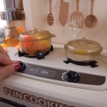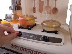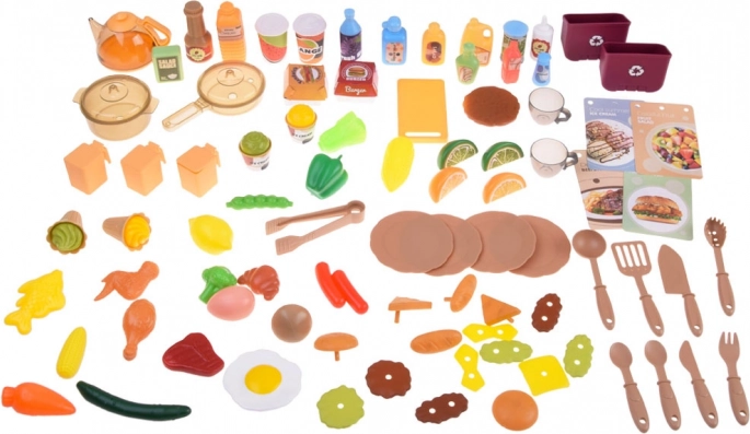 - Bohaté príslušenstvo – hrniec s pokrievkou, panvica, kanvička, náradie, riad, ovocie, zelenina, mäso aj dezerty.