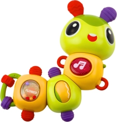 Táto farebná senzorická húsenica bola navrhnutá tak, aby prirodzene podporovala rozvoj dieťaťa – od stimulácie zmyslov, cez tréning úchopu a koordinácie, až po pochopenie príčiny a následku. Otočné segmenty s rozsahom 360°, klikanie, LED svetielka a melódie robia z hry zábavnú a podnetnú aktivitu každý deň.
